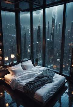 moody aesthetic, beautiful cozy, cramped bedroom with floor to ceiling glass windows overlooking a cyberpunk city at night, view from top of skyscraper, white bedsheets, bookshelves, thunderstorm outside with torrential rain, detailed, high resolution, photorrealistic, dark, gloomy,