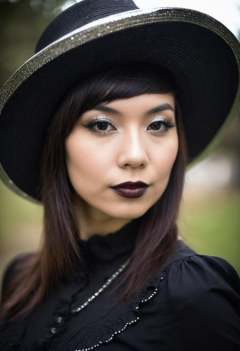 A woman wearing a hat poses for a picture, in the style of oshare kei, black, wide lens, shiny/ glossy, solapunk, dark silver, rim light