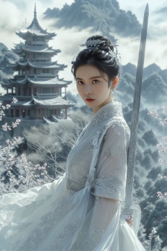 swordswoman, 1girl, architecture ,artist name ,bare tree ,black hair, branch, bridge ,brown eyes, building castle ,cherry blossoms ,chinese clothes ,closed mouth ,cloud ,cloudy sky, day, dress, earrings ,east asian architecture ,flower ,jewelry, lips ,looking at viewer, moon ,mountain ,mountainous horizon ,outdoors, pagoda ,realistic, sky ,snow ,solo ,tower ,tree ,watermark, web address ,winter ,sword ,Hanfu