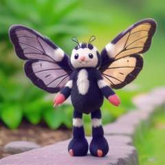 <lora:stuffed_toy1.5v1.2:1>stuffed toy, no humans, pokemon \(creature\), solo, blurry, looking at viewer, blurry background, outdoors, wings, full body, smile, insect wings, black eyes, antennae, standing, bug, animal focus, depth of field