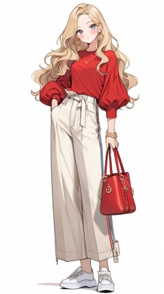 (best quality), ((masterpiece)), (highres), illustration, original, extremely detailed . <lora:日式动漫人设GIRL版XL:0.8>ooo, 1girl, solo, white background, jewelry, shoes, holding bag, bag, holding, full body, blush, earrings, pants, simple background, long hair, standing, blonde hair, bracelet, white footwear, sneakers, long sleeves, hand in pocket, shirt, looking at viewer, puffy long sleeves, red shirt, wavy hair, puffy sleeves, handbag, grey eyes