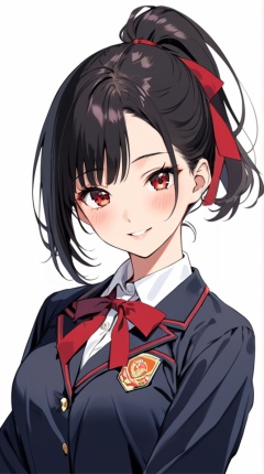 (best quality), ((masterpiece)), (highres), illustration, original, extremely detailed . <lora:日式动漫人设GIRL版XL:0.7>ooo,1girl, solo, shuuchiin academy school uniform, shinomiya kaguya, school uniform, black hair, red eyes, white background, smile, ribbon, looking at viewer, simple background, red ribbon, long sleeves, blush, bangs, parted bangs, folded ponytail, black dress, hair ribbon, dress, upper body, neck ribbon, sidelocks, short hair, parted lips, breasts