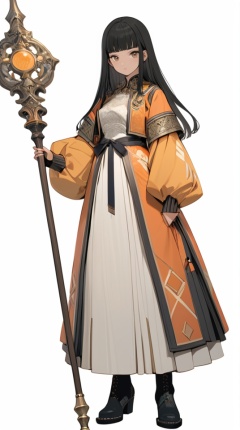 (best quality), ((masterpiece)), (highres), illustration, original, extremely detailed . <lora:日式动漫人设GIRL版XL:0.7>ooo, 1girl, solo, holding, full body, white background, staff, long hair, black hair, holding staff, standing, simple background, long sleeves, looking at viewer, bangs, brown eyes, black footwear, boots, dress, blunt bangs, closed mouth