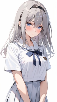 (best quality), ((masterpiece)), (highres), illustration, original, extremely detailed . <lora:日式动漫人设GIRL版XL:0.7>ooo,1girl, solo, shuuchiin academy school uniform, dress, blue eyes, white dress, white background, long hair, school uniform, simple background, bangs, blush, hairband, breasts, short sleeves, black ribbon, hair between eyes, summer uniform, ribbon, grey hair, neck ribbon, closed mouth, black hairband, small breasts, looking to the side, own hands together, looking away