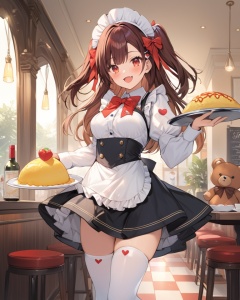 (best quality), ((masterpiece)), (highres), illustration, original, extremely detailed . <lora:日式动漫人设GIRL版XL:0.7>ooo, 1girl, solo, stuffed animal, thighhighs, food, bottle, open mouth, stuffed toy, long hair, white thighhighs, fang, smile, holding, waitress, hair ornament, menu, maid headdress, brown hair, teddy bear, looking at viewer, :d, wine bottle, omelet, plate, two side up, heart, food-themed hair ornament, bow, long sleeves, omurice, skirt, stuffed cat, bangs, frills, cat, shirt, underbust, white shirt, blush, yellow bow, bowtie, tray, puffy sleeves, red eyes, holding plate, buttons, juliet sleeves, breasts, standing, small breasts