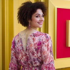 (masterpiece, best quality, ultra high res, photorealistic, realistic, *** *****, real person, photograph), (amazing, finely detail, an extremely delicate and beautiful,oncept art), intricate detail, professional, official art,1girl, long curly hair, thigh, full body, Sexy, summer dress, (floral print:1.2), big chest, mellow, big chest,big, butt, (modern fashion background:1.2), studio, luxury, gorgeous, JoJo pose, Rings, earrings, necklace, bangle, closed smile,(neon:1.2), Low shutter, most beautiful artwork in the world, aesthetics, atmosphere, dynamic Angle,