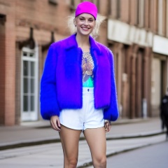1girl,solo, (((masterpiece))), (((best quality))), ((ultra-detailed))large hair band, exposed umbilicus, bare legsWhite cropped navel, wide coat, shorts, capCool girlSkateboardblue purple hairPunk stylingJacket coat, silver necklace, stud earringsRapped pants, torn clothesLeg trim, waist hangerBody paintingCyber.night, neon, street, garbage, lightsSmileStretch