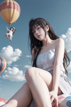 <lora:发型:0.8>,((best quality)),(masterpiece),(Highly detailed),(wallpaper),an extremely delicate and beautiful girl,beautiful detailed face,blouse,casual,hair_ornament,suspender skirt,(kind_smile:0.8),(full body),(((sitting on a giant balloon))),((aerial)),((float)),landing,updrafts,((colorful hair)),((streaked hair)),Gradient color eyes,colorful background,high saturation,surrounded by colorful splashes,surrounded by colorful dot,shining,(dream balloons),((beautiful skies)),(Kinetic Art),(fantasyArt),dreamlike,((dynamic_angle)),from_below,((foreshortening)),<lora:绪儿-超梦幻场景_V1:0.5 >,