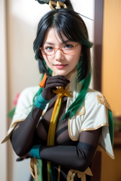 masterpiece, best quality, 8K,realistic, HDR,(photoshop \(medium\):1.6),15yo,<lora:xianyun-v2:1>,1girl, glasses, solo, smile, gloves, looking at viewer, multicolored hair, green hair,upper body, hair ornament, bangs, long hair, ponytail, blue hair, simple background, black hair, semi-rimless eyewear, two-tone hair, red-framed eyewear, bespectacled, black gloves