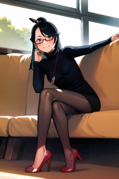 masterpiece, best quality, <lora:comiclo:1>,<lora:xianyun-v2:1>,1girl, solo, pantyhose, glasses, long hair, skirt, red footwear, sitting, crossed legs, black hair, high heels, red-framed eyewear, red skirt, lanyard, semi-rimless eyewear, looking at viewer, black pantyhose, window, turtleneck, breasts, pencil skirt, long sleeves, black sweater, very long hair, multicolored hair, under-rim eyewear, ponytail, alternate costume, blue eyes, shirt, id card, indoors, full body, hair ornament, turtleneck sweater, office lady, black shirt, closed mouth, sweater, artist name, smile, bangs, blue hair