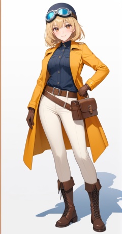 (best quality), ((masterpiece)), (highres), illustration, original, extremely detailed,1girl, solo, gloves, blonde hair, smile, coat, white background, full body, brown footwear, boots, goggles, looking at viewer, standing, brown eyes, hand on hip, closed mouth, simple background, blush, long sleeves, helmet, medium hair, goggles on headwear, belt, pants, hat, brown gloves, pouch