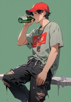(best quality), ((masterpiece)), (highres), illustration, original, extremely detailed . <lora:日式动漫人设BOY版XL:0.7>jjj, 1boy, solo, pants, male focus, shirt, hat, black pants, red headwear, grey shirt, torn pants, simple background, bottle, black hair, sitting, earrings, torn clothes, holding, jewelry, drinking, green background, short hair, baseball cap, short sleeves, holding bottle, profile, white shirt, artist name, stud earrings