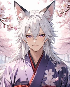 (best quality), ((masterpiece)), (highres), illustration, original, extremely detailed . <lora:日式动漫人设BOY版XL:0.7>jjj, 1boy, male focus, animal ears, solo, long hair, cherry blossoms, purple eyes, japanese clothes, fox ears, looking at viewer, upper body, petals, smile, white hair, fox boy, hair between eyes, kimono