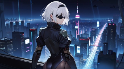 (best quality), ((masterpiece)), (highres), illustration, original, extremely detailed,<lora:SNQX:0.7>1girl, yorha no. 2 type b, white hair, jacket, weapon, solo, short hair, from behind, hairband, robot joints, joints, holding, night, black blindfold, cityscape, black jacket, black hairband, blindfold, holding weapon, city, cyberpunk, alternate costume, building, leotard, gun, city lights, outdoors