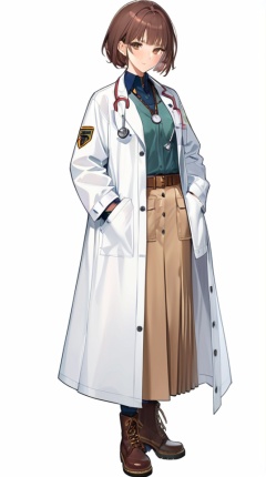 (best quality), ((masterpiece)), (highres), illustration, original, extremely detailed,<lora:SNGame Character XL:0.7>1girl, solo, white background, full body, brown eyes, brown hair, looking at viewer, shirt, simple background, belt, standing, brown footwear, long sleeves, skirt, jewelry, hands in pockets, closed mouth, coat, short hair, long skirt, labcoat, white coat, white jacket, stethoscope, boots, open clothes, parted bangs, bangs, blush