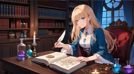 (best quality), ((masterpiece)), (highres), illustration, original, extremely detailed,<lora:SNQX:0.7>1girl, book, blonde hair, candle, long hair, solo, bookshelf, open book, bug, quill, flask, butterfly, table, potion, sitting, indoors, magic circle, cup, smile, blue eyes, chair