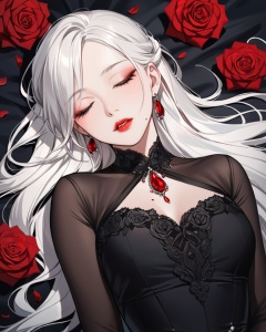 (best quality), ((masterpiece)), (highres), illustration, original, extremely detailed,<lora:SNQX:0.7>1girl, solo, rose, mole, long hair, flower, closed eyes, parted lips, red flower, dress, jewelry, mole under mouth, red rose, upper body, red lips, on back, lips, mole under eye, black dress, eyelashes, white hair