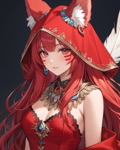 (best quality), ((masterpiece)), (highres), illustration, original, extremely detailed,<lora:SNQX:0.7>1girl, solo, red hair, animal ears, feathers, dress, hood, red dress, facial mark, long hair, looking at viewer, ears through headwear, jewelry