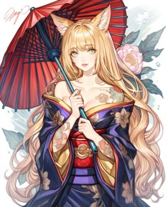(best quality), ((masterpiece)), (highres), illustration, original, extremely detailed, <lora:NO Name Art:0.7>1girl, umbrella, solo, blonde hair, animal ears, tattoo, flower, holding, holding umbrella, japanese clothes, long hair, parted lips, oil-paper umbrella, bare shoulders, signature, kimono, looking at viewer