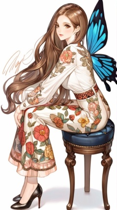 (best quality), ((masterpiece)), (highres), illustration, original, extremely detailed, <lora:NO Name Art:0.7>1girl, solo, butterfly, long hair, bug, flower, sitting, high heels, white background, brown hair, long sleeves, stool, floral print, pants, brown eyes, chair, signature, simple background