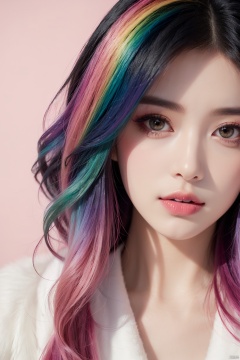 masterpiece, best quality, 1girl, pure rainbow background, ((rainbow swirling vortexes colourful hair)), wear white fur coat, ((long Hair)), front, emotional face, ((close up, studio light, studio)), (((makeup portrait, pink eye shadow)))