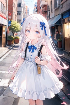 A petite, young girl with long red hair and a white dress walks on the gray street under the glow of the street lamps. As she looks up at the camera, her gaze reflects the light, creating a gentle glow that captivates the audience.