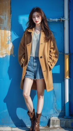 sdmai, lanmeng, 1girl, solo, jewelry, long hair, shorts, boots, hands in pockets, brown hair, necklace, standing, looking at viewer, brown coat, brown jacket, red lips, parted lips, full body, coat, sweater, lips<lora:SDMAI蓝梦lanmeng:0.7>,