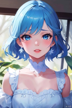 (best quality,masterpiece, original, extremely detailed 8K wallpaper)((absurdres)),(ultra-detailed), (illustration), (detailed light), (an extremely delicate and beautiful), (highres) (1 girl:1.4),(solo:1.4),(8K), (exquisite CG), (master's work),(outline),((exquisite face details)), a woman in a blue dress surrounded by snowflakes and trees, blue earrings, red lips, 1 girl, solo, short hair, blue lilies, blue skirt, blue bow, blue hair, blue ruffles, blue eyes, long eyelashes, tears, blue table, lolita Fashion, blue theme, blue blue blue blue, blue, dynamic posture,crazy colors , negative_hand