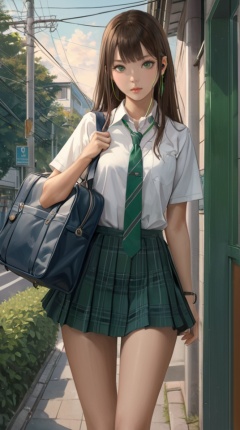 (best quality), ((masterpiece)), (highres), illustration, original, extremely detailed,   <lora:ACG ART3_XL:0.7>1girl, solo, shibuya rin, long hair, green eyes, necktie, earphones, school uniform, bag, looking at viewer, jewelry, brown hair, school bag, earrings, skirt, earbuds