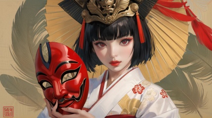 (best quality), ((masterpiece)), (highres), illustration, original, extremely detailed,   <lora:ACG ART3_XL:0.7>1girl, solo, triangular headpiece, black hair, short hair, japanese clothes, red lips, holding mask, red eyes, looking at viewer, holding, parted lips, mask, bangs, kimono, blunt bangs, white kimono, feathers, mask removed, lips, body writing, upper body