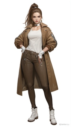 (best quality), ((masterpiece)), (highres), illustration, original, extremely detailed, <lora:ACG ART3_XL:0.7>1girl, solo, white background, full body, jacket, gloves, ponytail, pants, simple background, jewelry, choker, earrings, white footwear, shirt, looking at viewer, hand on hip, standing, fingerless gloves, brown jacket, twitter username, brown hair, shoes