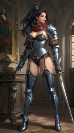 (best quality), ((masterpiece)), (highres), illustration, original, extremely detailed,   <lora:ACG ART3_XL:0.7>1girl, breasts, solo, thighhighs, long hair, blue eyes, boots, weapon, high heels, large breasts, cleavage, sword, armor, black hair, ponytail, jewelry, thigh boots, gauntlets, earrings, pauldrons, high heel boots, scarf, standing, shoulder armor, cross-laced footwear, garter straps