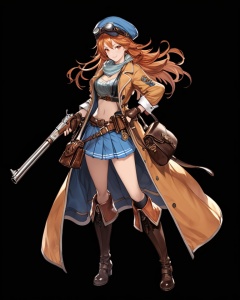 (best quality), ((masterpiece)), (highres), illustration, original, extremely detailed, <lora:JTのGame Character XL:0.7>1girl, weapon, gun, hat, solo, gloves, bag, fingerless gloves, long hair, full body, skirt, transparent background, goggles, orange hair, boots, orange eyes, long coat, smile, navel, antique firearm, midriff, belt, handgun, looking at viewer, striped, holding