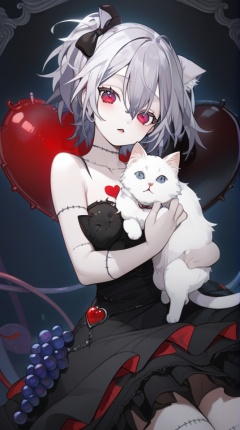 (best quality), ((masterpiece)), (highres), illustration, original, extremely detailed, <lora:淡彩の华美病娇:0.7>1girl, stitches, cat, solo, dress, grey hair, black dress, holding, looking at viewer, fruit, red eyes, food, patchwork skin, grapes, short hair, one side up, pale skin, hair between eyes, animal, heart