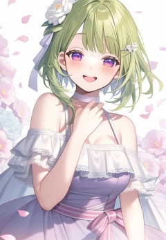 (best quality), ((masterpiece)), (highres), illustration, original, extremely detailed, <lora:淡彩の华美病娇:0.7>1girl, solo, flower, hair ornament, smile, hair flower, looking at viewer, blush, green hair, open mouth, white background, petals, purple eyes, bangs, dress, multicolored eyes, choker, bare shoulders, short hair