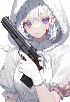 (best quality), ((masterpiece)), (highres), illustration, original, extremely detailed, <lora:淡彩の华美病娇:0.7>1girl, weapon, ring, gun, holding, gloves, holding weapon, jewelry, solo, white gloves, holding gun, white theme, hood, blood on face, blood, blood on clothes, white background, looking at viewer, bird, white hair, parted lips, dress, handgun, hood up, upper body, bow, bangs, simple background, puffy sleeves, earrings, purple eyes, white dress, fur-trimmed hood, white bow, animal on shoulder, short hair, ear piercing, grey bow