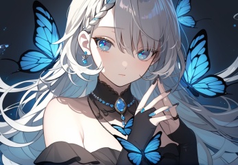 (best quality), ((masterpiece)), (highres), illustration, original, extremely detailed, <lora:淡彩の华美病娇:0.7>1girl, solo, butterfly, braid, bug, long hair, looking at viewer, blue butterfly, jewelry, dress, hair ornament, black dress, hair between eyes, upper body, bare shoulders, bangs, ring, nail polish, steepled fingers, braided bangs, black nails, grey eyes, bridal gauntlets, blue eyes, closed mouth, grey hair