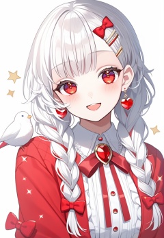 (best quality), ((masterpiece)), (highres), illustration, original, extremely detailed, <lora:淡彩の华美病娇:0.6>1girl, holding, solo, red eyes, jewelry, holding knife, bow, white hair, knife, hair bow, white background, hair ornament, long hair, looking at viewer, smile, earrings, blush, red bow, upper body, hairclip, open mouth, bangs, long sleeves, red jacket, shirt, bird, braid, simple background, head tilt, twin braids, jacket, sparkle, brooch, animal, heart, white shirt, watch, :d