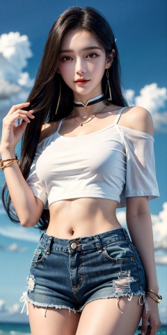 cowboy shot, Blue sky, white clouds, ocean,nai3, 1girl, shorts, solo, crop top, black shorts, choker, navel, shirt, midriff, crop top overhang, looking at viewer, white shirt, jewelry, breasts, bare shoulders, short shorts, off-shoulder shirt, off shoulder, black choker, thighs, stomach, hand on own thigh, long hair, bracelet, short sleeves, ribbon, hand up, collarbone, hair ribbon, medium breasts, standing, high-waist shorts, dolphin shorts, bra strap, , hair ornament, thigh gap, necklace, expressionless, , ,kind smile, , liushen