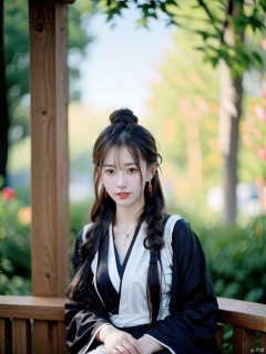 sdmai, jinghong, Chinese watercolor painting, Chinese style, splash-ink, sputtering, 1girl, solo, black hair, chinese clothes, jewelry, earrings, long hair, looking at viewer, hair bun, realistic, single hair bun, hanfu, upper body, hair ornament, jinghong,