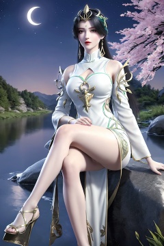sitting, (crossed_legs), dress, chinese_clothes, long_sleeves, looking_at_viewer, (scenery, waterfall, cherry_blossoms, milfeulle_sakuraba, full_moon, moon, night, moonlight, night_sky, sky, petals, water, stone),1girl, solo, black_hair, long_hair, hair_ornament, forehead_mark, facial_mark, jewelry, earrings,  (dress,  chinese_clothes, long_sleeves,  armor,  shield),  (cleavage), white_legwear, fingernails, nail_polish, makeup,(slender:1.3),photo_\(medium\),(8k, RAW photo, best_quality), (masterpiece:1.2),(realistic), (photorealistic:1.3), (ultra-detailed),(extremely_detailed_cg_8k_wallpaper),(crystal_texture_skin:1.3), (pale skin:1.4), (shiny:1.2),(shiny_skin:1.4),(extremely_delicate_and_beautiful),<lora:syqiangk_加强_重置_柳神_C9_5.2:0.8>,