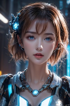 (masterpiece, best quality:1.2),1girl, blue eyes, breasts, cleavage, collarbone, earrings, glowing, jewelry, lips, looking at viewer, parted lips, realistic,Chest Glow,Silver all metal mecha, science fiction, short hair, solo, upper body,Mecha,Hard surface,Streamlined mecha,Realistic materials,Mechanical necklace,Glowing mecha,Multi light source mecha