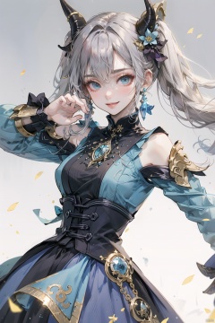 (ultra realistic,32k, masterpiece:1.2),(high detailed skin:1.1),( 8k uhd, dslr, high quality:1.1), masterpiece, best quality, ,nilou \(genshin impact\), horns,red hair,long hair,twintails,veil,aqua eyes,harem outfit,neck ring,jewelry,bare shoulders,long sleeves,crop top,brooch, bracer, gold trim,blue skirt,circlet,vision \(genshin impact\), grey background, smile,dancing