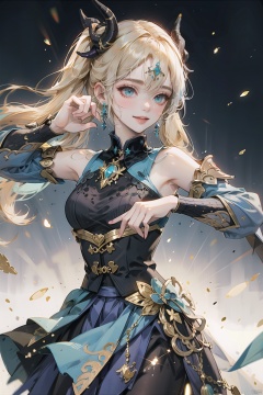 (ultra realistic,32k, masterpiece:1.2),(high detailed skin:1.1),( 8k uhd, dslr, high quality:1.1), masterpiece, best quality, ,nilou \(genshin impact\), horns,red hair,long hair,twintails,veil,aqua eyes,harem outfit,neck ring,jewelry,bare shoulders,long sleeves,crop top,brooch, bracer, gold trim,blue skirt,circlet,vision \(genshin impact\), grey background, smile,dancing
