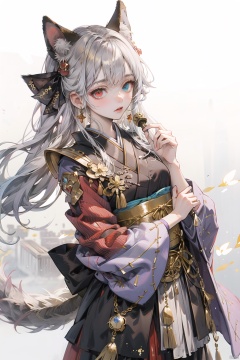 Woman with fox ears and tail holding a glave, wearing an japanesse armor, the scenario is a japan, heterochromia, red eyes