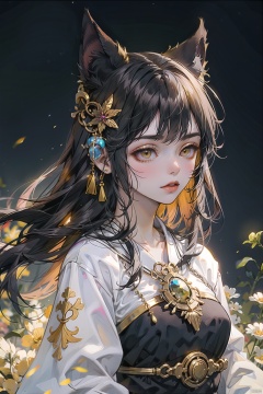 fox_tail,black-hair,5_figners,yellow_eyes,fox_girl,fox_ears,Ahri,midjourney,upper_body,1 girl,More Detail,perfect light,CJ painting
