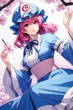 saigyouji_yuyuko_touhou,yuyuko_touhou, 1girl, triangular_headpiece, wide_sleeves, long_sleeves, blue_kimono,cherry_blossoms