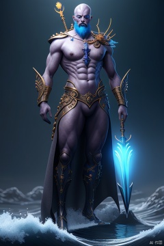 Poseidon, lord of the seas, glowing white eyes, wearing blue garments, trident in hand, commanding the waves of the seas, full body portrait dim volumetric lighting, 8k octane beautifully detailed render, post-processing, portrait, extremely hyper-detailed, intricate, epic composition, cinematic lighting, masterpiece, very very detailed, masterpiece, stunning Detailed matte painting, deep color, fantastical, intricate detail, splash screen, complementary colors, fantasy concept art, 8k resolution trending on Artstation Unreal Engine 5
