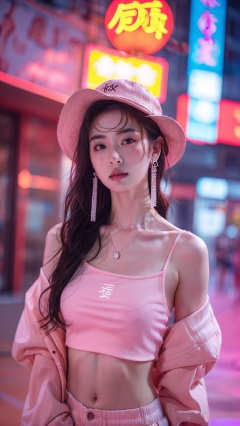 sdmai,fenfen, 1girl, jewelry, hat, realistic, long hair, solo, navel, blurry, blurry background, necklace, looking at viewer, breasts, earrings, midriff, brown hair, brown eyes, parted lips, piercing, neon lights <lora:SDMAI粉粉fenfen:0.7>