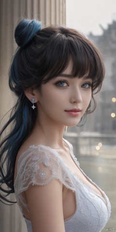 1girl, dance, Fairy, crystal, jewels,black, Crystal clear,solo, long hair, looking at viewer,black hair,jewelry, earrings,lips, makeup, portrait, eyeshadow, realistic, nose,{{best quality}}, {{masterpiece}}, {{ultra-detailed}}, {illustration}, {detailed light}, {an extremely delicate and beautiful}, a girl, {beautiful detailed eyes}, stars in the eyes, messy floating hair, colored inner hair, Starry sky adorns hair, depth of field, large breasts,cleavage,zj,